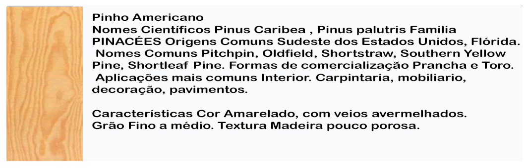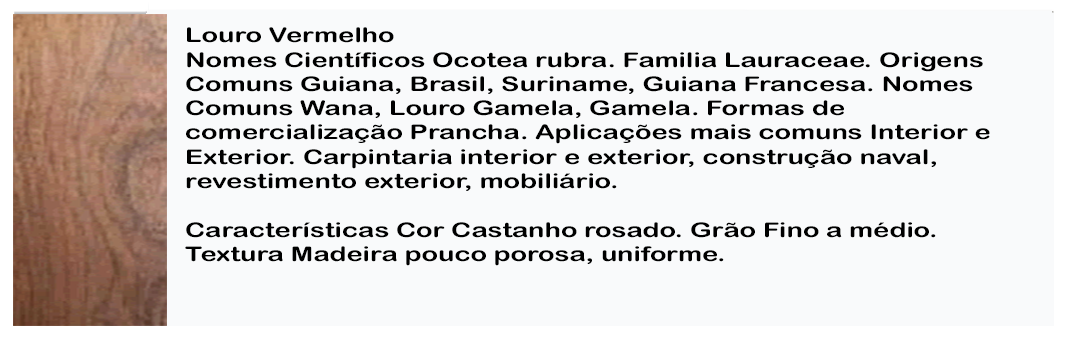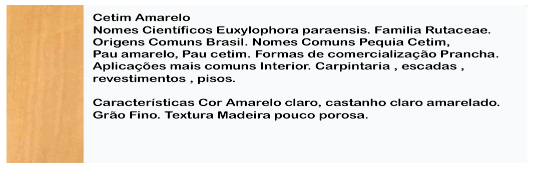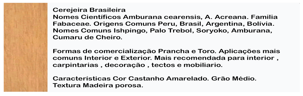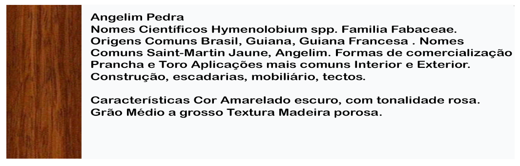 Amapá   Angelim Pedra   Cerejeira Brasileira   Cetim Amarelo   Cumaru   Garapa   Ipê   Itauba   Jatobá   Louro Vermelho   Sucupira   Tatajuba   Tauari